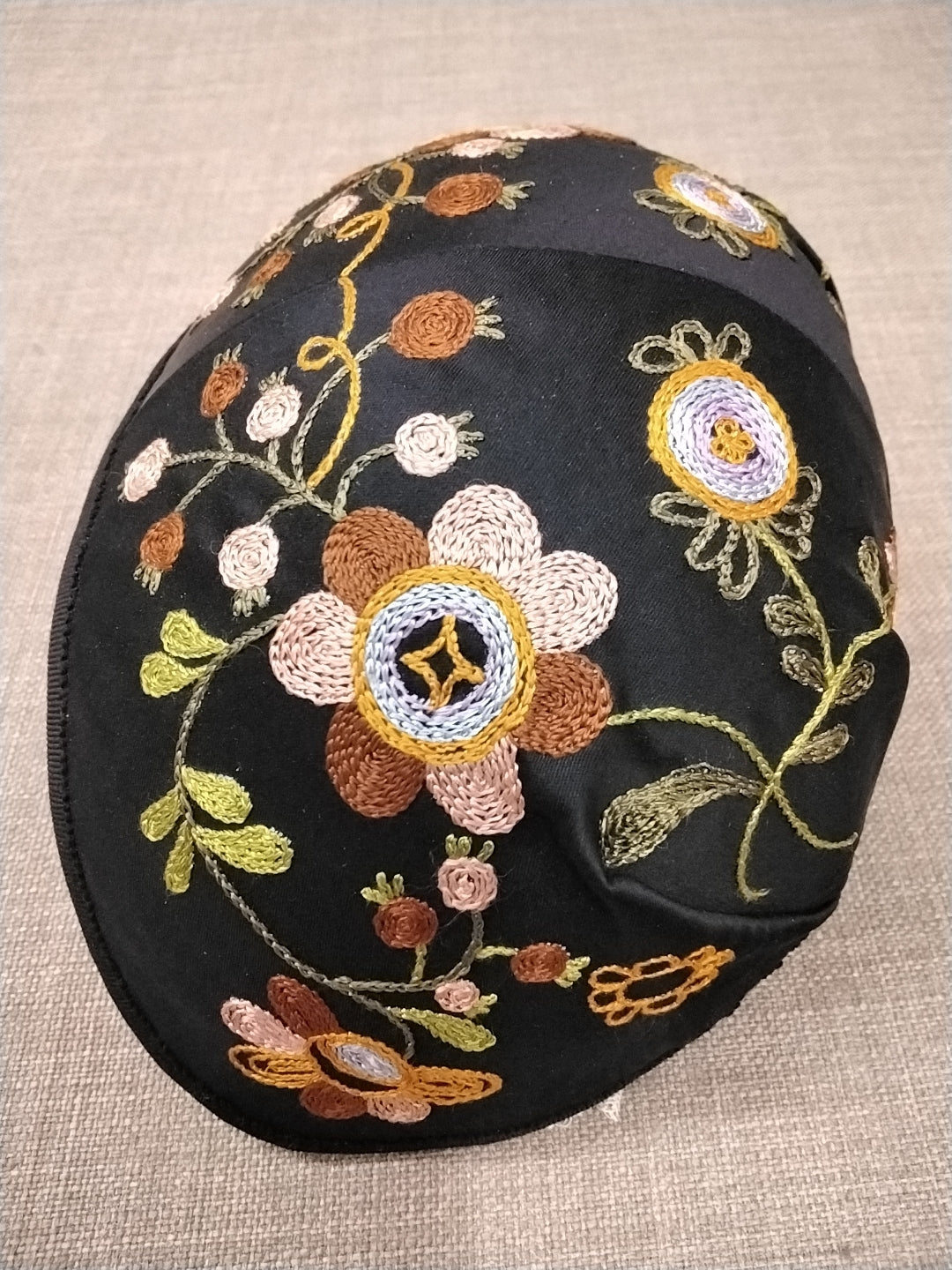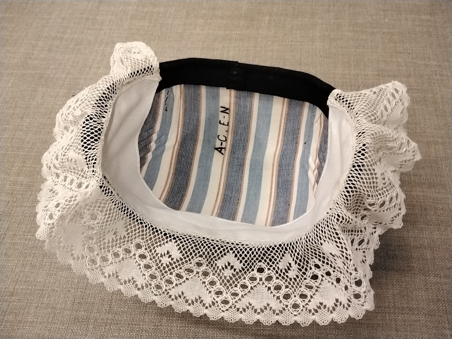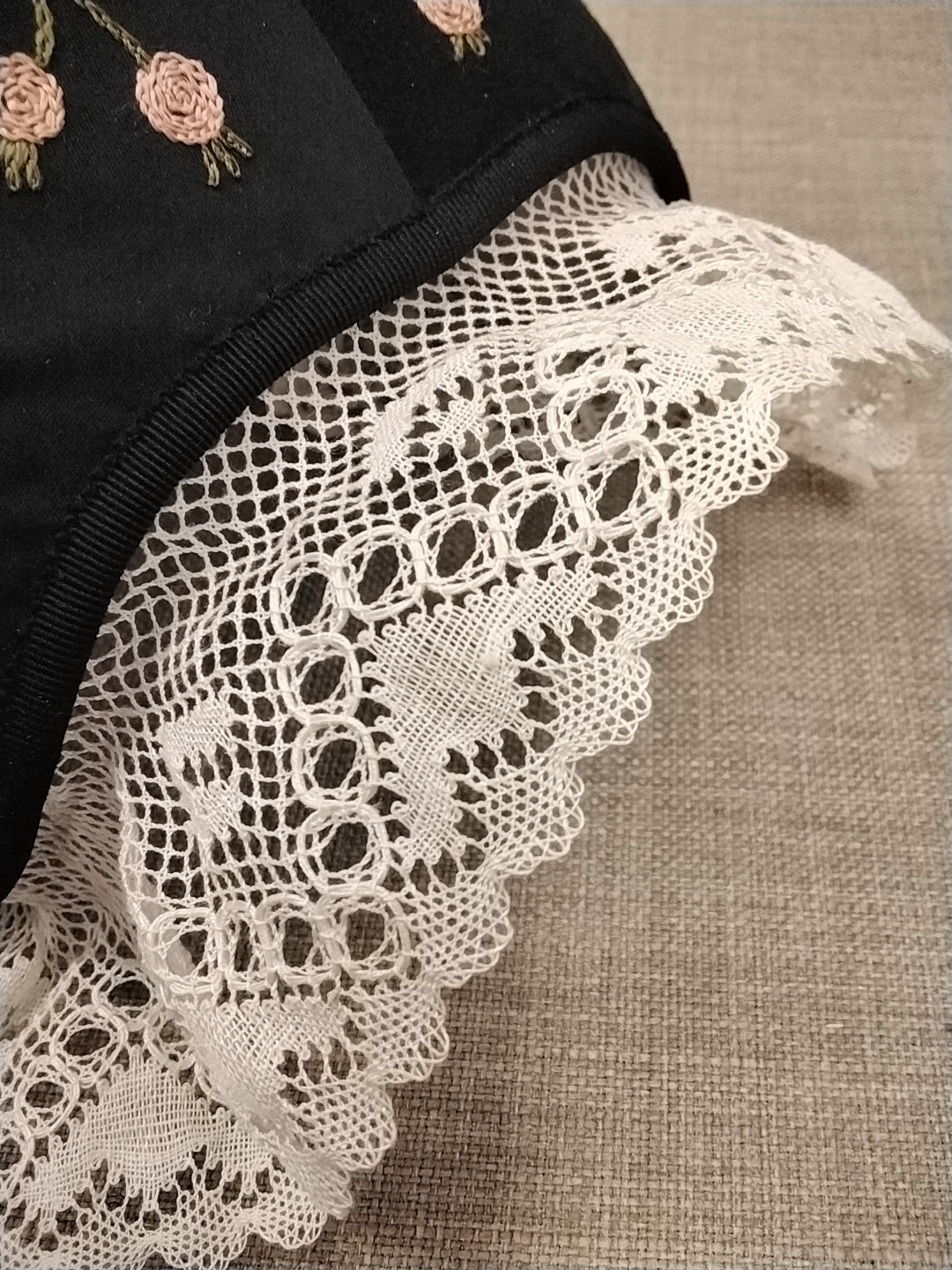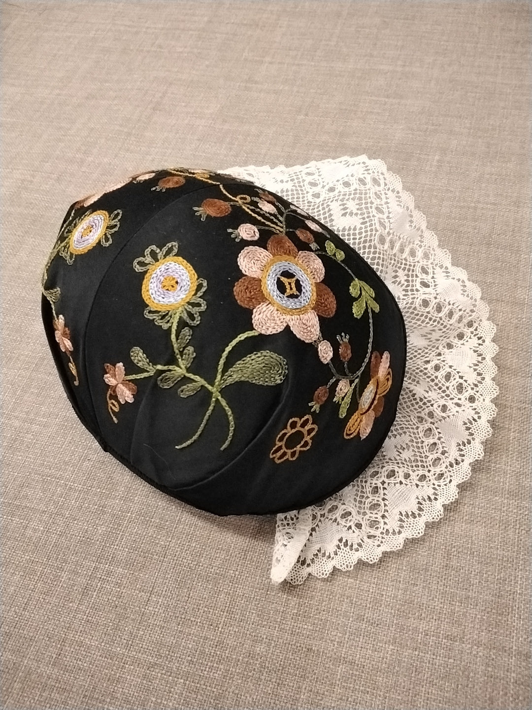 Begagnade bindemössa klädd i svart sildentyg med kedjestyngs broderier. Kantad med en knypplad spets.